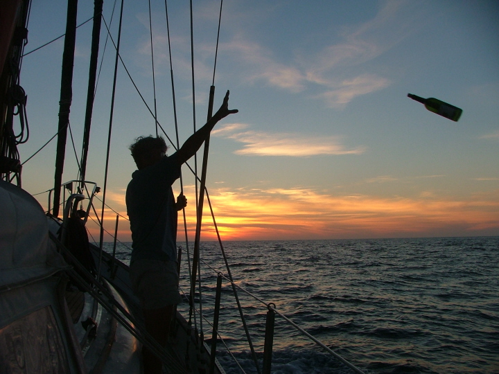 Here's Kay throwing the last of the bottle messages over the side. We were given 18 messages to cast into the sea during our voyages. We launched 6 on each of three crossings, near the middle of the southern Sea.