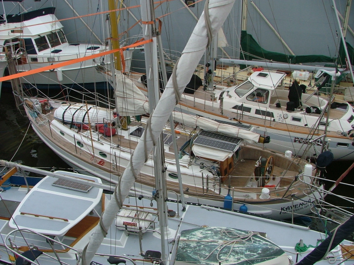 Once we were in and secured to the other boats, we turned around in time to get a photo of our friend Vince and crew on his Westsail 32, Alaya coming in to form part of the last row of boats.
