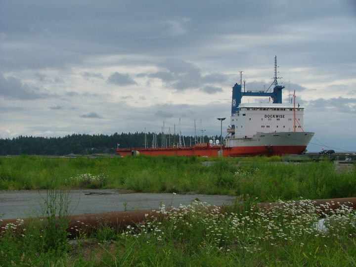 Rather than anchor, the DE12 moored here to the wharf at the Nanaimo Port Authority.